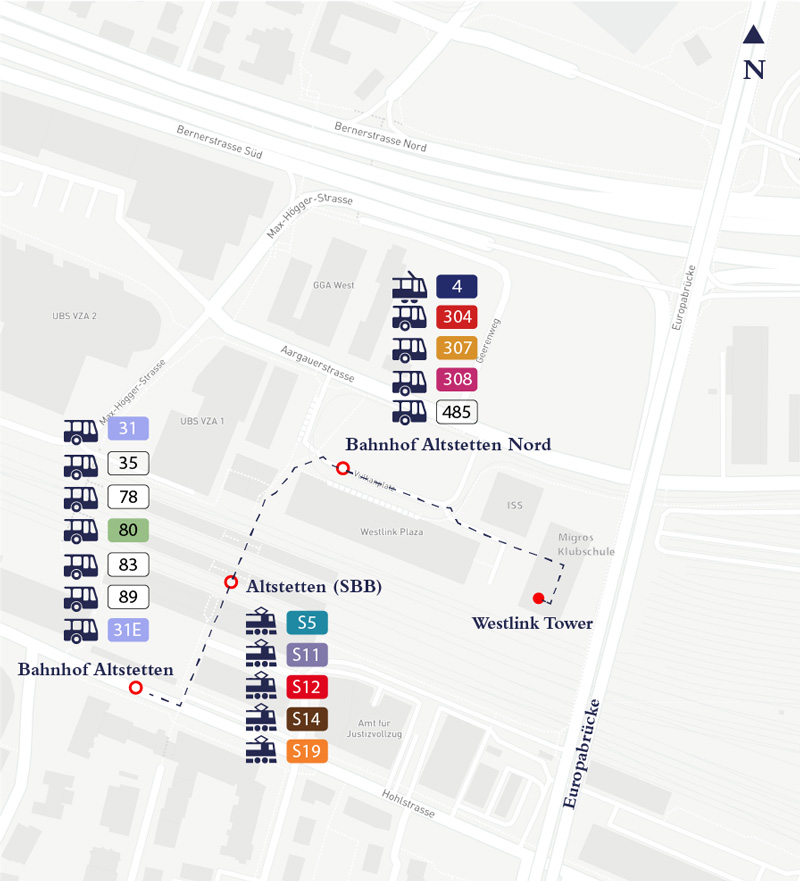 Das Zentrum für Gastroenterologie und Hepatologie befindet sich im 5. Stock (Lift) des Westlink Towers, direkt am Bahnhof Zürich Altstetten (Nord), oberhalb der Migros Klubschule. Es handelt sich um das Hochhaus direkt an der Europabrücke. Sie können sich die Wegleitung auch als PDF herunterladen und ausdrucken. PDF